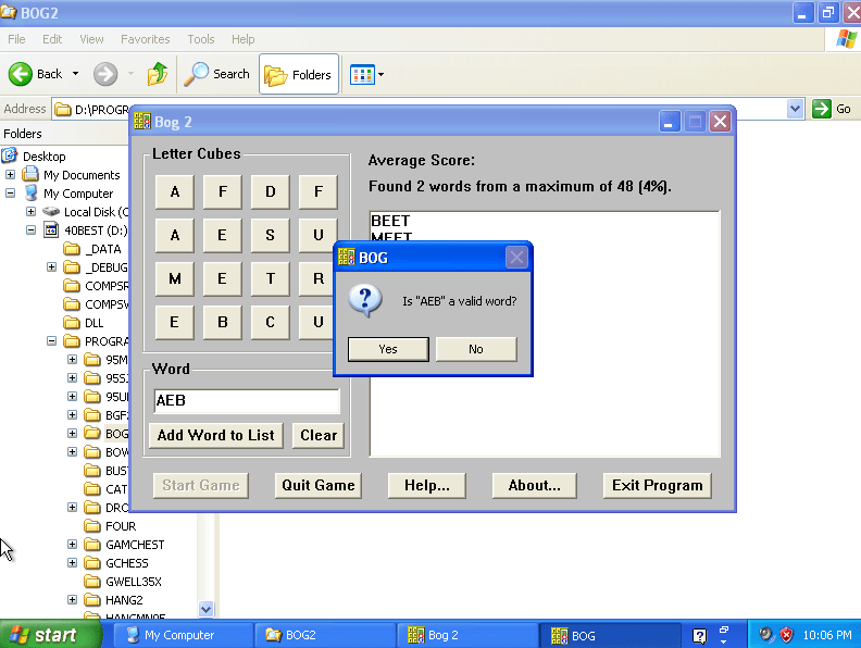 You can select the cubes to form words or type them in using the keyboard. The computer will tell you if the word is valid or not. The words enter cannot be shorter than three words in length or if it cannot be formed from adjacent cubes or use the same word twice. One of the more interesting points of this game is that if the word is not in BOG’s “dictionary” then you can choose to add it to the list of words that it will now know. I think that this could be a double edge sword as you could just make up your own words that have no meaning just to win or it could make for an interesting game of BOG.