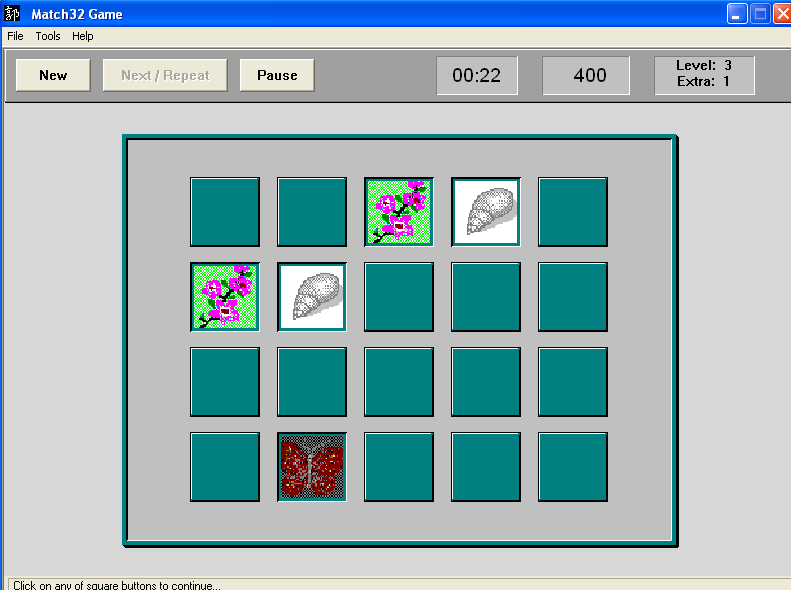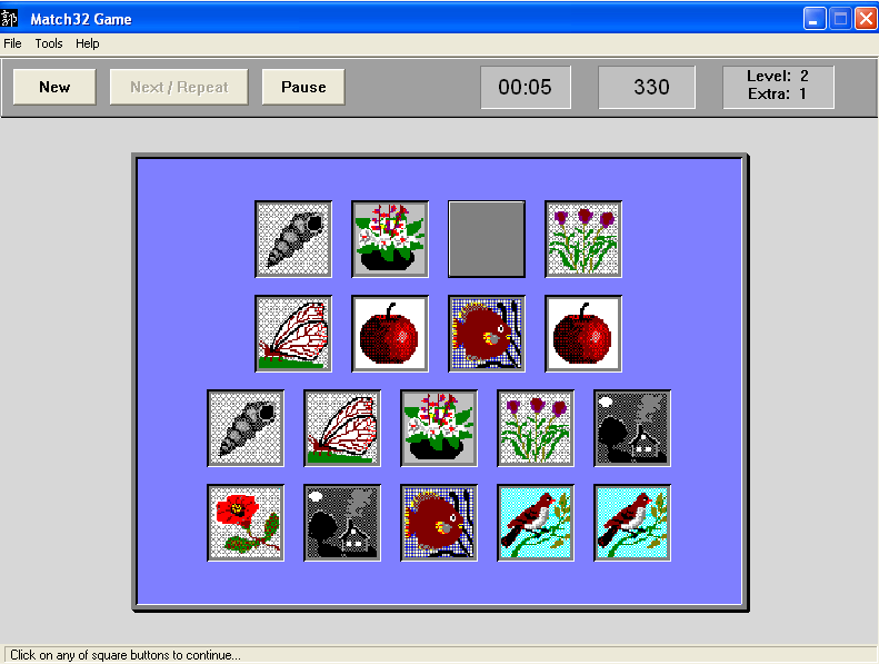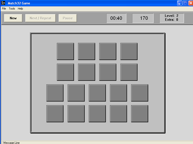 Match32 is a game of Concentration, developed by Yountong Kou in 1995, The goal of the game is to match pairs of pictures within a given time period in order to advance to the next level and to score more points. The number of pair of Pictures range from 8 pairs to 30 pairs depending on the level. In order to score more points, you should finish each level as fast as possible. This game an help increase your memory capacity and your ability to concentrate.