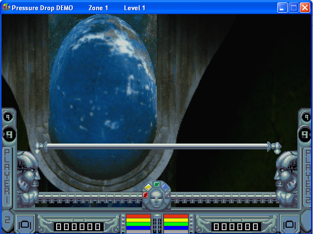 Pressure Drop is a very unique game. The object of the game is to use your Chromagun to destroy the descending bricks. In doing this you have to change the color of your Chromagun to shoot the corresponding color to the brick in order to destroy it. The way to win is to destroy all of the bricks but if nine bricks hit the ray at the bottom then you lose the game. There are passwords that will allow you to continue to later Zones in the game and there are twenty Zones to beat.