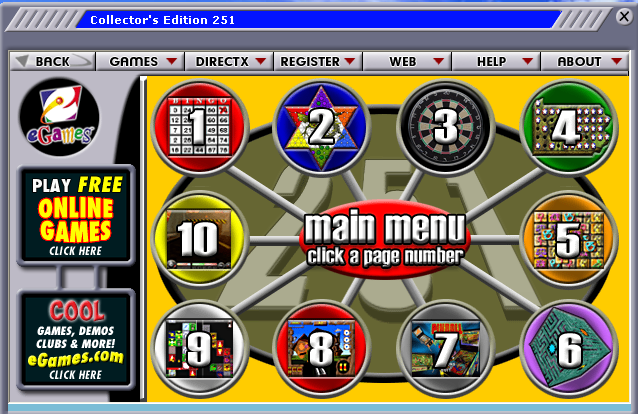 The eGames Collector’s Edition features over 251 Incredible games gathered together in one exclusive package! Choose from a wide variety of exciting categories including: Arcade, Board Games, Cards, Puzzles, Word Games, Strategy, Space Games… many more!